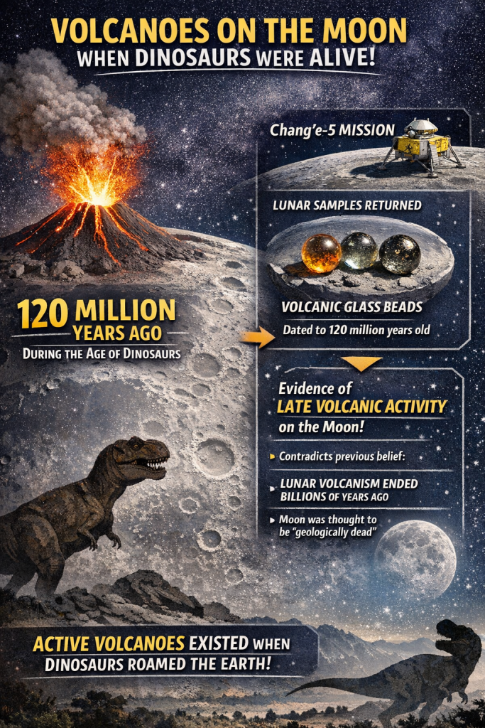 There were active volcanoes on the moon when dinosaurs were alive. with evidence showing eruptions occurred as recently as 120 million years ago.